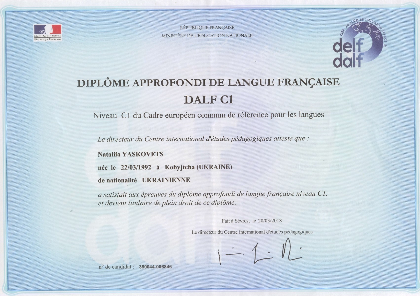 Я- Наталія, дипломований спеціаліст з французької мови з 9-ти річним досвідом роботи з різними віковими групами. Маю диплом міжнародного зразка DALF C1. Маю повну вищу освіту за напрямом підготовки «Філологія». Закінчила Київський національний лінгвістичний університет. Працюю в групах та індивідуально. Дипломи про проходження курсів та тренінгів для підвищення професійного рівня можна побачити нижче. Мої студенти- мої найкращі вчителі)