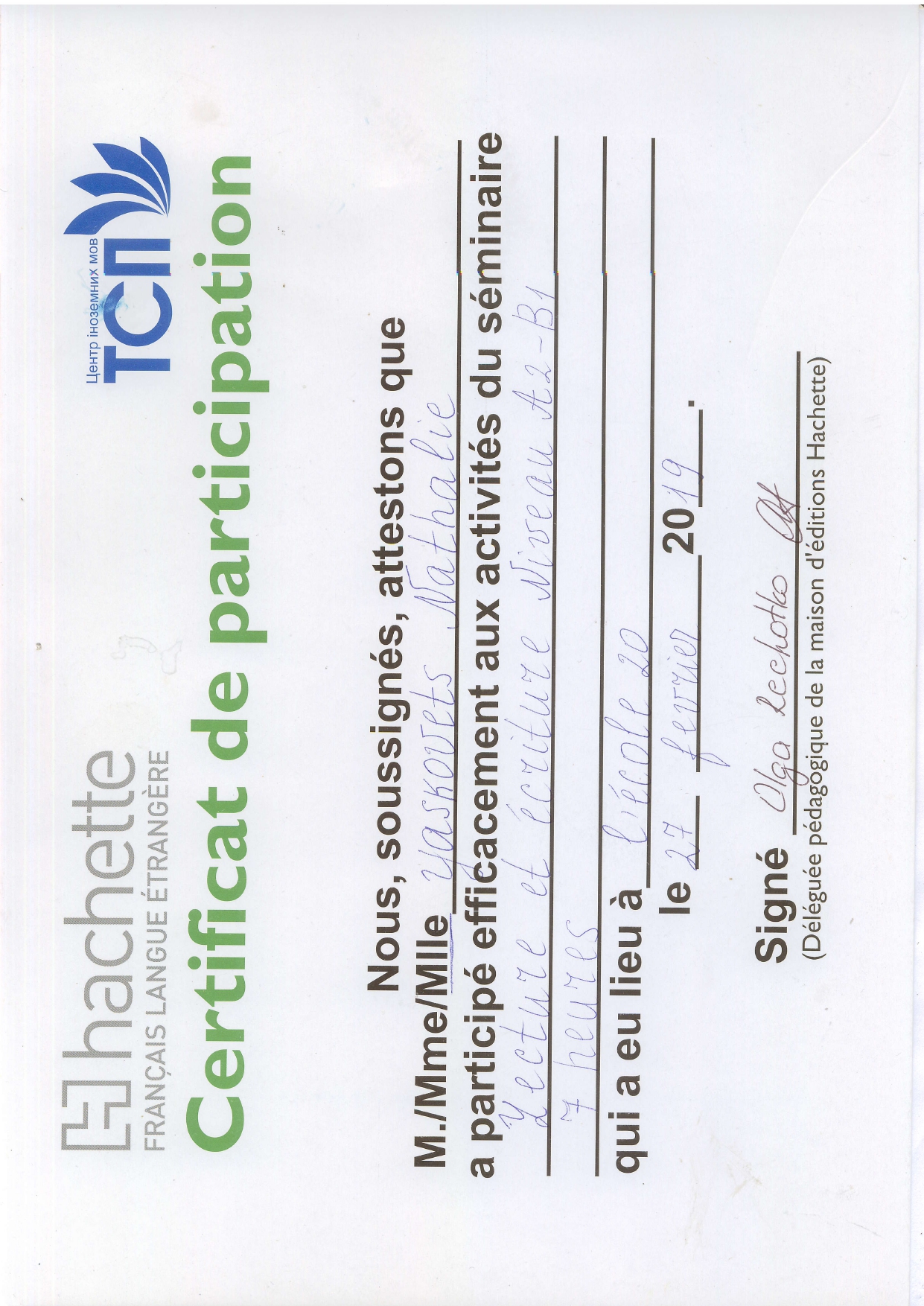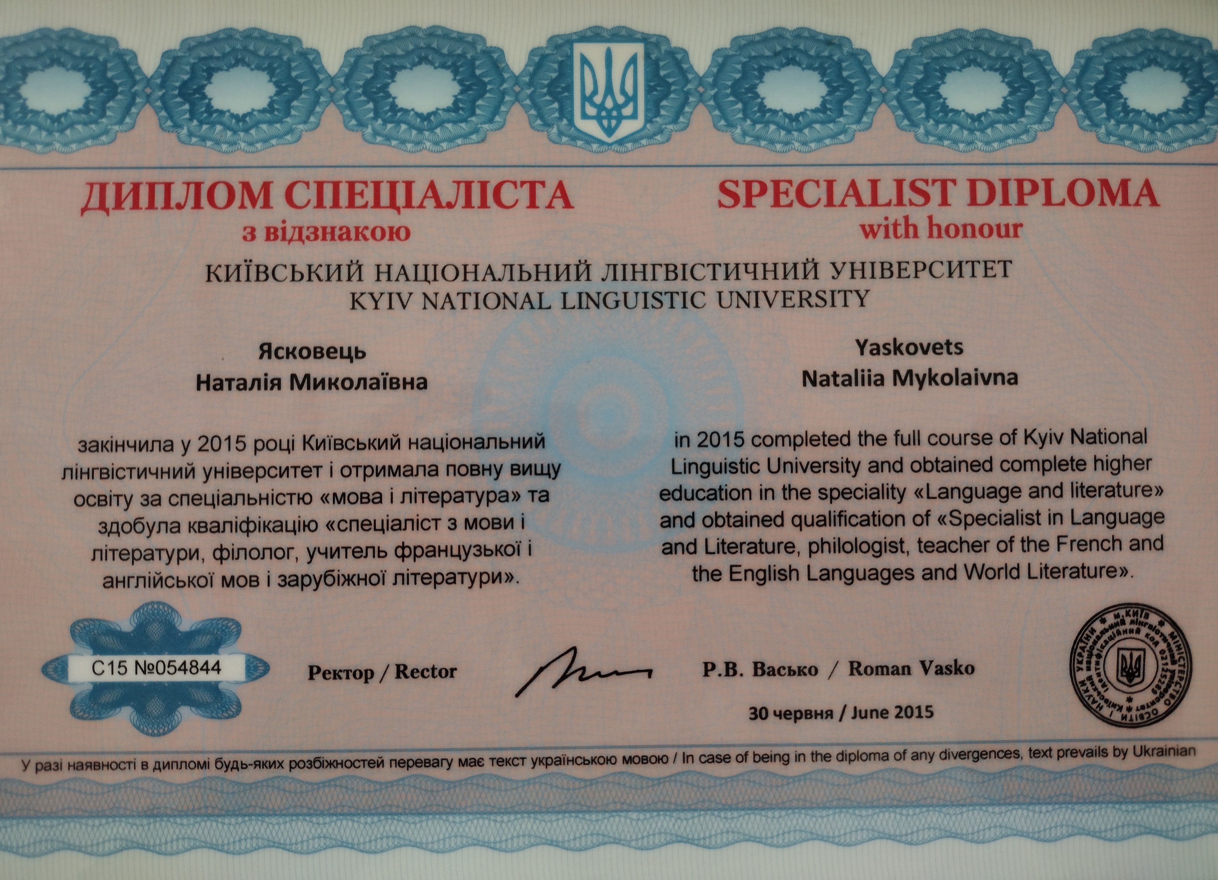 Я- Наталія, дипломований спеціаліст з французької мови з 9-ти річним досвідом роботи з різними віковими групами. Маю диплом міжнародного зразка DALF C1. Маю повну вищу освіту за напрямом підготовки «Філологія». Закінчила Київський національний лінгвістичний університет. Працюю в групах та індивідуально. Дипломи про проходження курсів та тренінгів для підвищення професійного рівня можна побачити нижче. Мої студенти- мої найкращі вчителі)